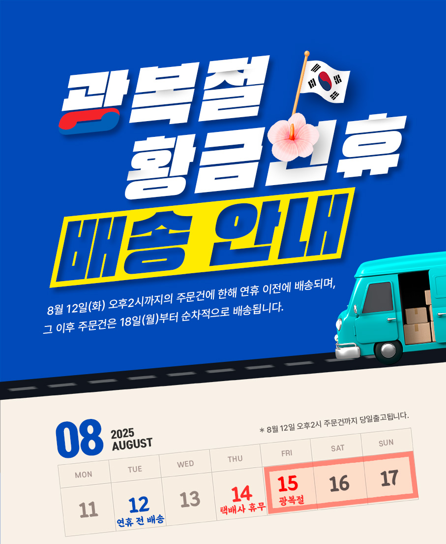 8월 14일 (목) 택배사 휴무로 인해, 배송이 불가합니다.