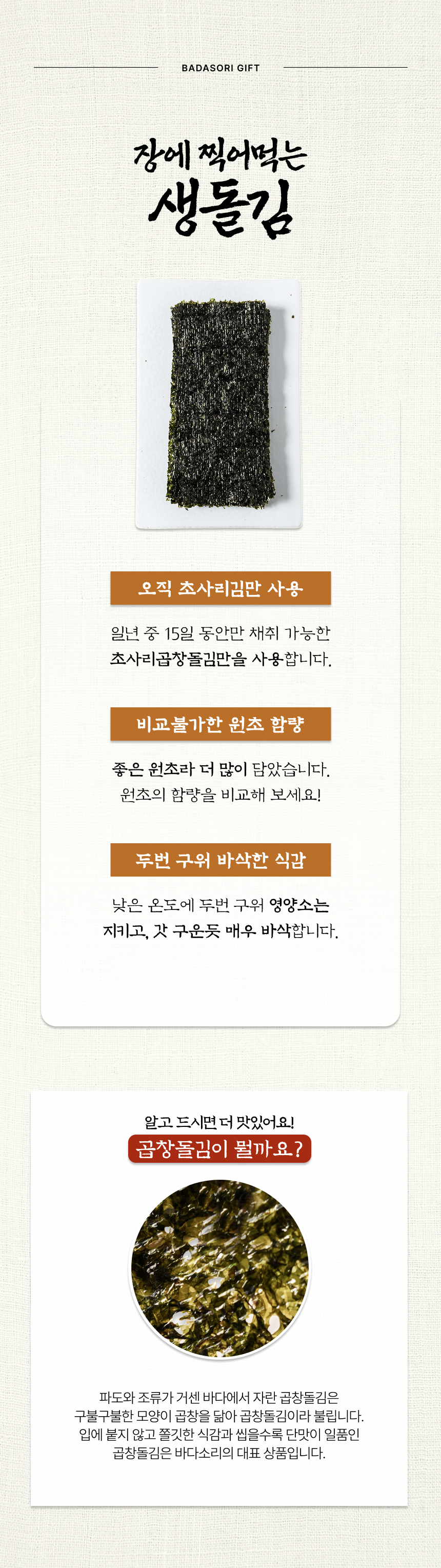 두번 구운 무조미 초사리 곱창김돌김