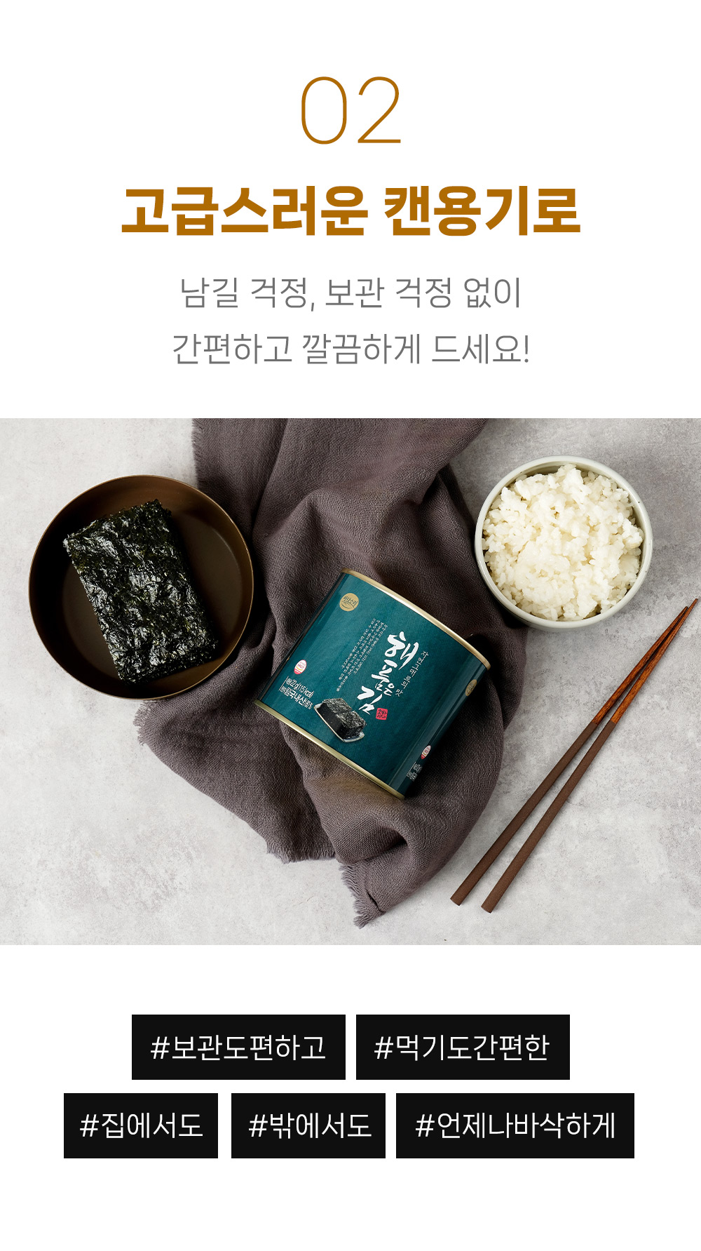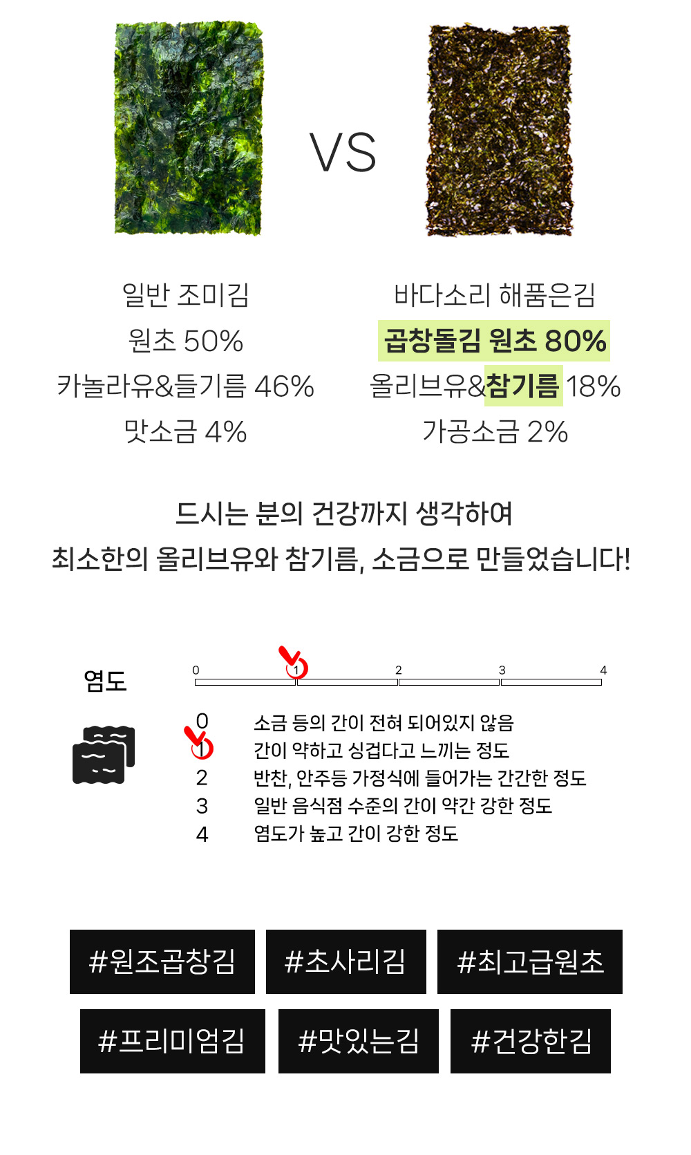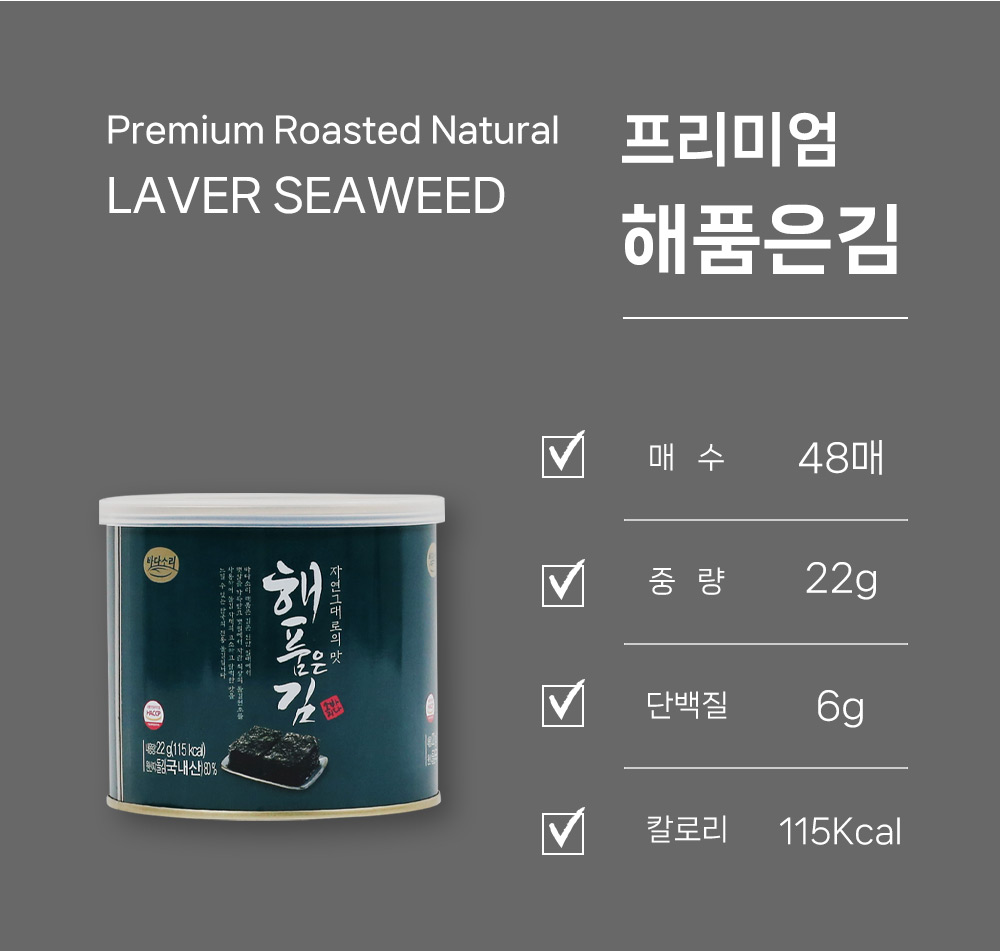 최소한의 소금과 올리브유로 구운 도톰한 식감의 프리미엄 고급김!
