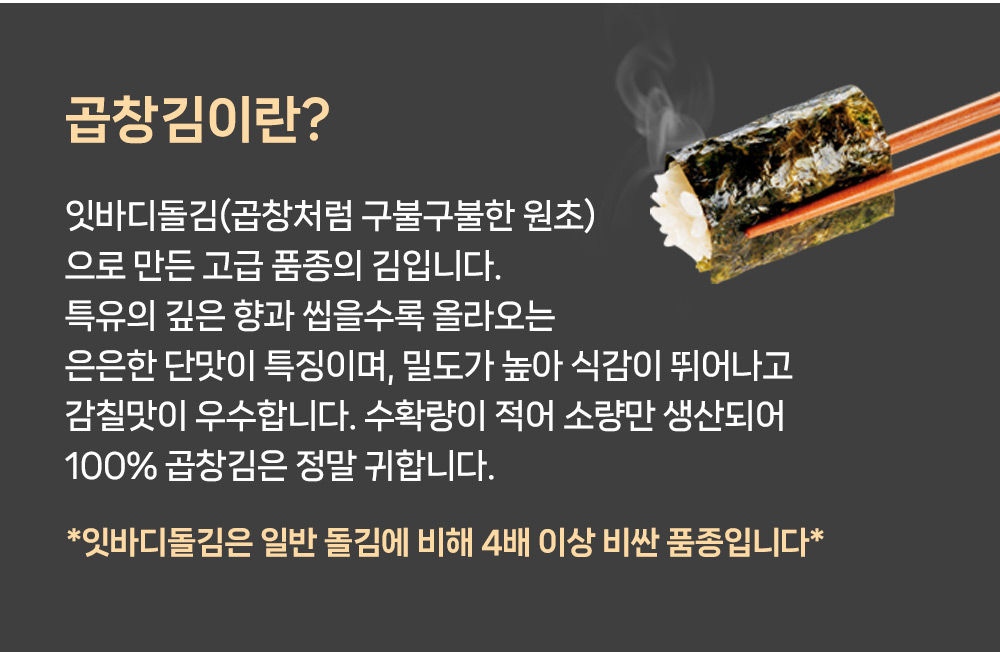 100% 초사리 곱창돌김으로 기름과 소금 없이